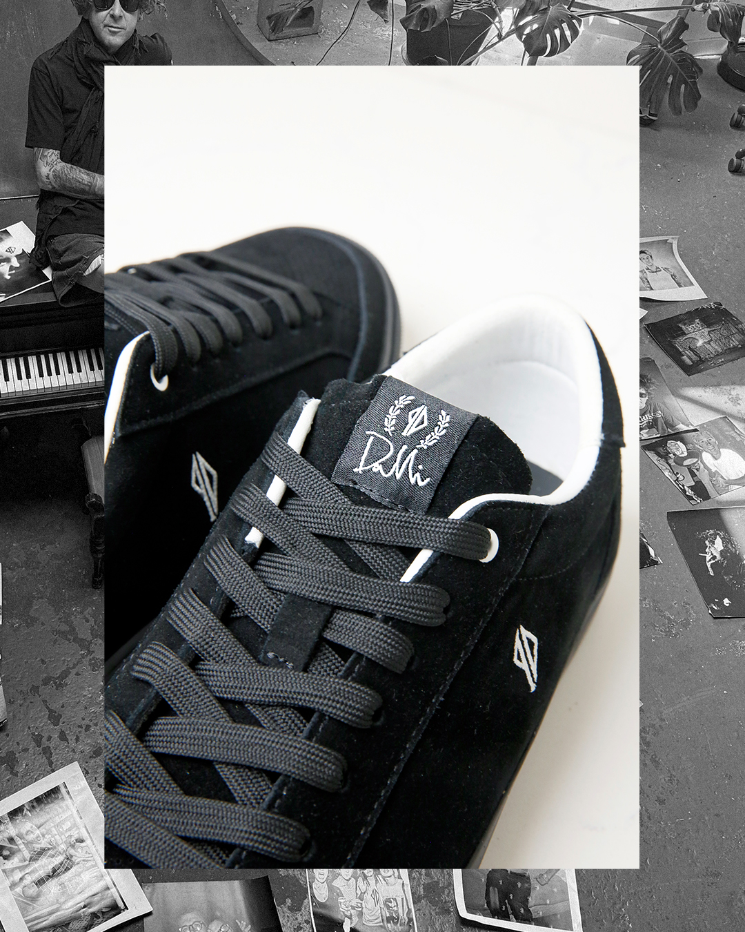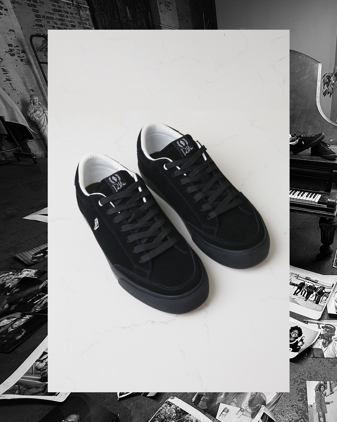 The DMC-1 re-designed by Dustin Dollin for this limited edition capsule collection outfitted in a rich black suede and contrasting white details. Black suede White pig suede lining Goddess insoles Embroidered PD logo Co branded PD / HOURS Lockup Signature Dollin woven label Custom PD shoe box.